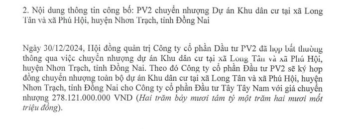 Công ty cổ phần Đầu tư PV2 lên kế hoạch chuyển nhượng dự án tại Đồng Nai cho Công ty cổ phần Đầu tư Tây Tây Nam với giá 278,12 tỷ đồng.