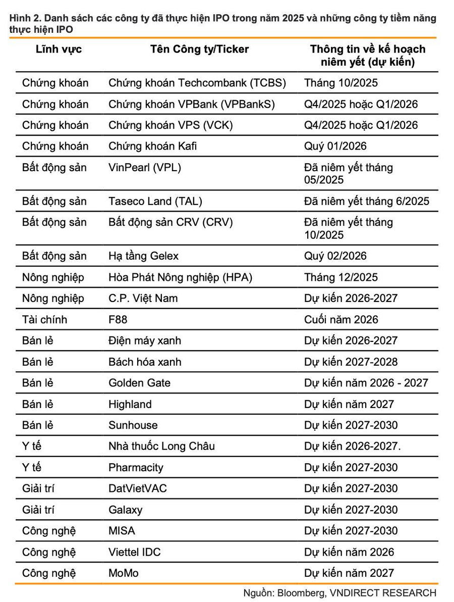 Bước sang năm 2025, nền tảng vĩ mô ổn định được đánh giá đang mở ra triển vọng cho một làn sóng IPO mới. Báo cáo nhận định, sau giai đoạn dài trầm lắng, hoạt động IPO sẽ khởi sắc mạnh mẽ, bắt đầu một chu kỳ mới. Danh mục thương vụ tiềm năng được dự báo trải rộng trên nhiều lĩnh vực, có thể kể đến các doanh nghiệp tiêu biểu trong ngành tiêu dùng như Highlands, Golden Gate; lĩnh vực dịch vụ tài chính như TCBS, VPBankS, VPS, F88. Các lĩnh vực khác gồm giải trí (DatvietVAC), công nghệ (Misa, VNLife) và bất động sản (VPL, TAL, Viettel IDC).
