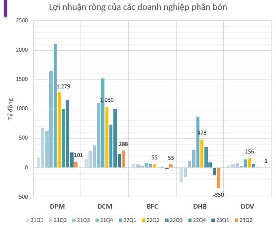 Một doanh nghiệp khác cũng ghi nhận lợi nhuận giảm sâu như hai ông lớn Đạm Phú Mỹ và Đạm Cà Mau là DAP - Vinachem (mã chứng khoán: DDV) . Cụ thể, doanh nghiệp này ghi nhận lợi nhuận quý 2/2023 chưa đến 1 tỷ đồng, giảm 99% so với cùng kỳ. Phân bón Bình Điền (mã chứng khoán: BFC) là doanh nghiệp có lợi nhuận giảm ít nhất trong nhóm với mức 4% còn 53 tỷ đồng.