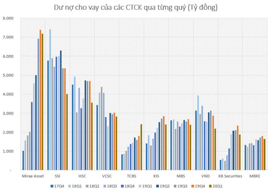Để gia tăng nguồn lực cho vay cũng như thực hiện các sản phẩm phái sinh, hàng loạt CTCK đã tăng vốn lên trên 1.000 tỷ đồng. Trong đó, các CTCK vốn Hàn Quốc với tiềm lực tài chính hùng hậu đã mau chóng vươn lên trở thành đối thủ cạnh tranh đáng gờm với các tên tuổi trong nước, từ chất lượng dịch vụ cho tới số lượng chi nhánh và đặc biệt ở khả năng cung cấp nguồn vốn cho vay (margin). Trong quý 1 vừa qua, dư nợ cho vay margin của CTCK vốn Hàn Quốc Mirae Asset lên tới hơn 7.100 tỷ đồng, bằng xấp xỉ hai "đại gia" trong nước là SSI và HSC cộng lại.