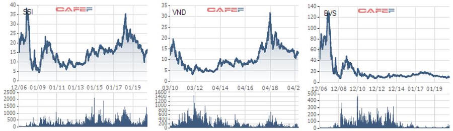 Tiêu biểu như SSI, cổ phiếu đầu ngành chứng khoán hiện chỉ giao dịch quanh mức giá 16.000 đồng/cp, gần như không thay đổi so với thời điểm mới lên sàn vào năm 2007 (tính theo giá điều chỉnh). Tương tự, nhiều cổ phiếu lớn trong ngành như SHS, VND cũng không có nhiều biến động về thị giá so với thời điểm mới lên sàn cách đây khoảng 1 thập kỷ.