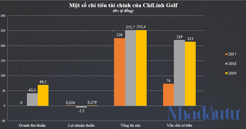 Như năm 2017 và 2018, doanh thu thuần của ChiLinh Golf lần lượt ở mức 0 và 42,2 tỷ đồng, tuy nhiên lỗ thuần trong năm 2018 ở 5,5 tỷ đồng. Sang năm 2019, doanh thu thuần tăng lên thành 69,5 tỷ đồng, song lợi nhuận thuần lại khá khiêm tốn với 279 triệu đồng.