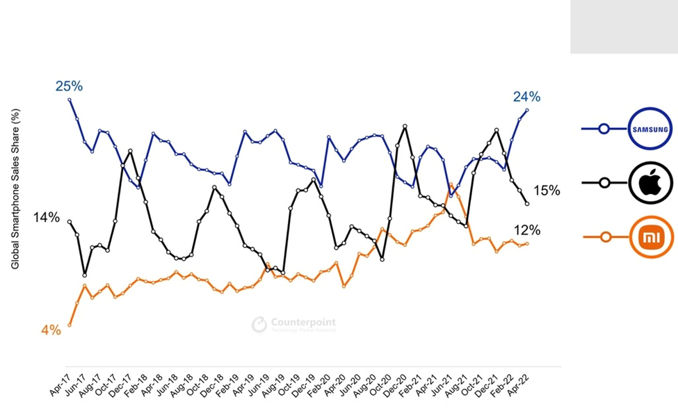 Tarun Pathak, Giám đốc Nghiên cứu Counterpoint cho biết một trong những lý do giúp Samsung vẫn giữ được kết quả tốt là do các mẫu Galaxy A thuộc phân khúc tầm trung và Galaxy S22 ở dòng cao cấp có doanh số cao. Những chiến dịch quảng cáo giúp Samsung vượt qua các đối thủ sừng sỏ khác.