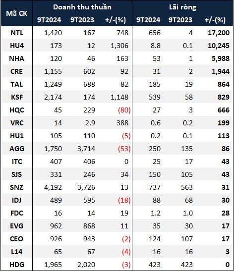 Bên cạnh các ông lớn kể trên, doanh nghiệp gây bất ngờ nhất chính là CTCP Phát triển Đô thị Từ Liêm (HOSE: NTL) khi lãi ròng 9 tháng gấp 173 lần cùng kỳ, đạt gần 656 tỷ đồng. Qua đó, NTL đứng đầu trong 19 doanh nghiệp có lãi tăng trong kỳ, đồng thời góp mặt vào top 10 doanh nghiệp lợi nhuận cao nhất.