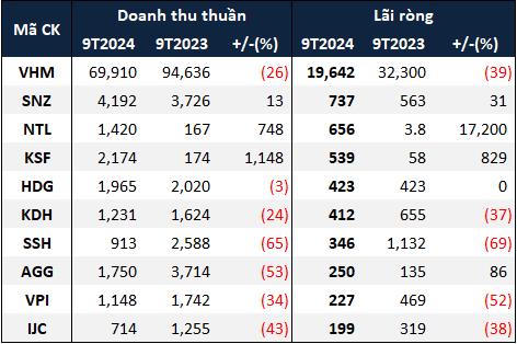 Theo VietstockFinance, doanh thu thuần và lợi nhuận ròng của 84 doanh nghiệp bất động sản nhà ở trên sàn đã công bố BCTC trong 9 tháng đầu năm 2024 lần lượt giảm 17% và 44% so với cùng kỳ, còn hơn 111.3 ngàn tỷ đồng và hơn 20.5 ngàn tỷ đồng. Trong đó, có 19 doanh nghiệp báo lãi tăng, 36 doanh nghiệp lãi giảm, 5 doanh nghiệp từ lỗ thành lãi và 5 doanh nghiệp từ lãi thành lỗ.