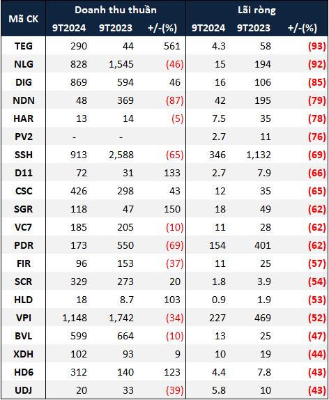 Bên cạnh các doanh nghiệp lãi giảm, có 23 doanh nghiệp bất động sản nhà ở lỗ sau 9 tháng đầu năm. Lỗ nặng nhất là CTCP Tập đoàn Đầu tư Địa ốc No Va (HOSE: NVL) với hơn 4.1 ngàn tỷ đồng, dù doanh thu tăng 57%. Nếu không có khoản lỗ của NVL, tổng lợi nhuận ròng của ngành giảm hơn 34% so với cùng kỳ thay vì 44%.