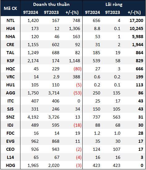 Mặt khác, 7 doanh nghiệp có lợi nhuận vượt kế hoạch năm (chiếm tỷ lệ hơn 8%), bao gồm NTL, Đầu tư Phát triển Sài Gòn Co.op (UPCoM: SID), Địa ốc Sài Gòn Thương Tín (HOSE: SCR), Tập đoàn Sunshine (HNX: KSF), Vạn Phát Hưng (HOSE: VPH), Bất động sản và Đầu tư VRC (HOSE: VRC) và Tổng Công ty Đầu tư Phát triển Nhà và Đô thị Nam Hà Nội (HOSE: NHA).