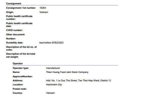 SPS Việt Nam đề nghị 2 cơ quan trên chỉ đạo kiểm tra, xác minh và yêu cầu Công ty CP Thực phẩm Thiên Hương có giải pháp khắc phục ngay trong trường hợp có vi phạm để đảm bảo sức khỏe người tiêu dùng, tránh ảnh hưởng đến uy tín, chất lượng sản phẩm xuất khẩu của Việt Nam.