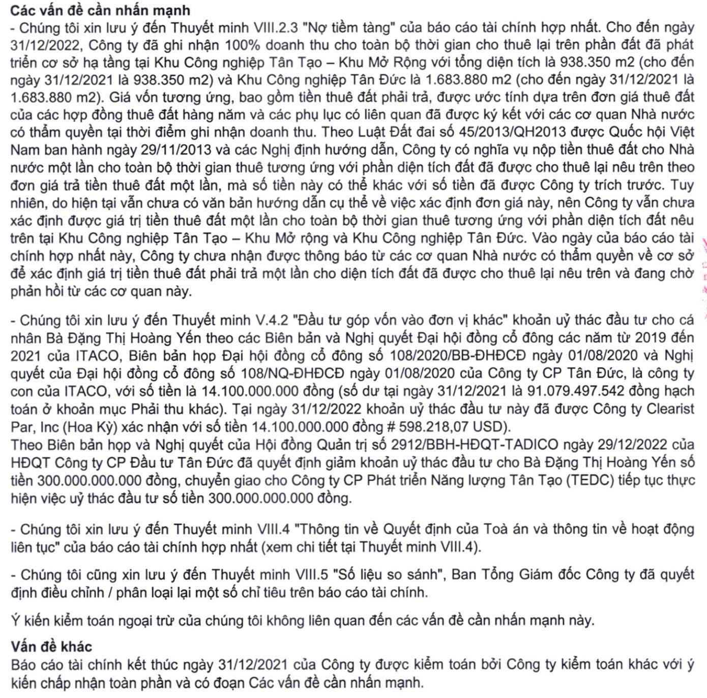 Ngoài ra, kiểm toán còn nhấn mạnh đến nhiều vấn đề trên BCTC kiểm toán năm 2022 của ITA liên quan đến thuyết minh các khoản mục như nợ tiềm tàng, đầu tư góp vốn vào đơn vị khác, quyết định của Toà án và thông tin về hoạt động liên tục…
