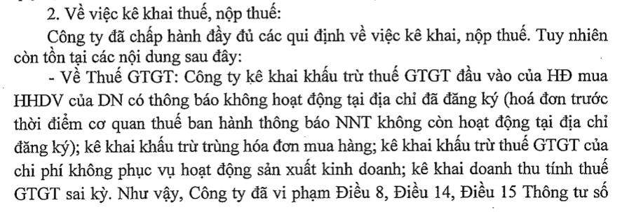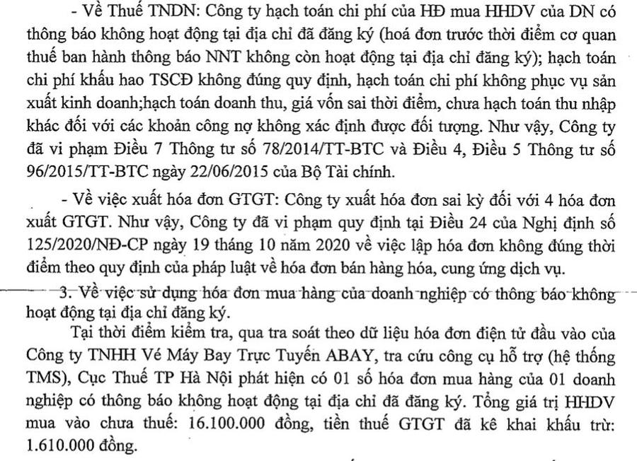 Kết luận Thanh tra của Cục Thuế TP Hà Nội chỉ ra, công ty này đã có một số vi phạm, tồn tại liên quan đến kê khai thuế giá trị gia tăng, thuế thu nhập doanh nghiệp và xuất hóa đơn giá trị gia tăng.