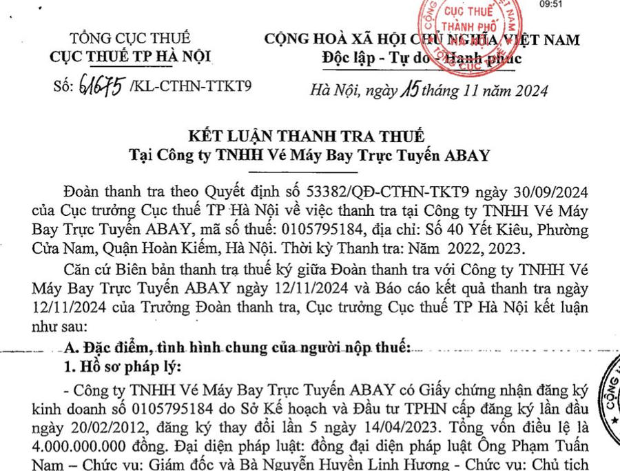 Cục thuế thành phố Hà Nội đã ban hành kết luận thanh tra thuế tại Công ty TNHH Vé máy bay trực tuyến ABAY (Công ty ABAY), có địa chỉ tại 40 Yết Kiêu, phường Cửa Nam, Hoàn Kiếm, Hà Nội.