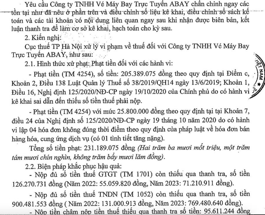 Sau thanh tra, công ty vé máy bay trực tuyến ABAY bị phạt và truy thu hơn 1,3 tỷ đồng tiền thuế