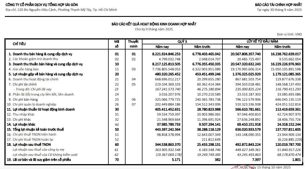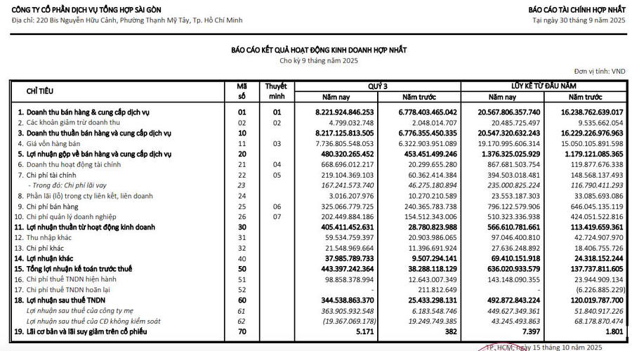 CTCP Dịch vụ Tổng hợp Sài Gòn (Savico, mã ck: SVC) vừa công bố báo cáo tài chính hợp nhất quý III/2025 với lợi nhuận tăng trưởng ấn tượng.