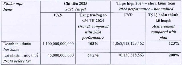 Cụ thể, Savimex đặt mục tiêu doanh thu thuần đạt 1.100 tỷ đồng trong năm 2025, tăng 3% so với năm 2024. Tuy nhiên, chỉ tiêu lợi nhuận trước thuế lại chỉ ở mức 45 tỷ đồng, giảm tới 36% so với kết quả ước tính của năm trước.