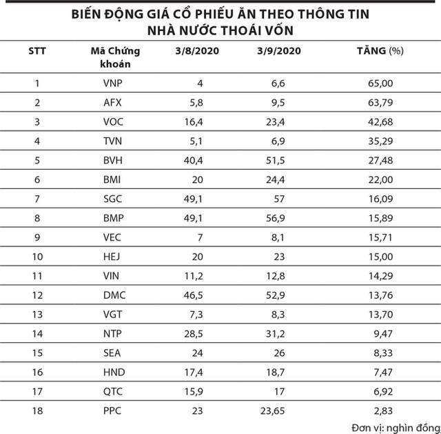Trong tháng 8, xu hướng tăng giá của một loạt cổ phiếu ăn theo thông tin Nhà nước thoái vốn (xem bảng) cho thấy, thị trường khá hứng khởi với nhóm cổ phiếu này.