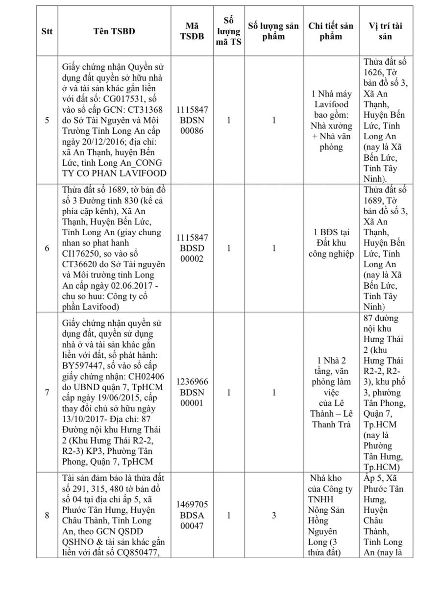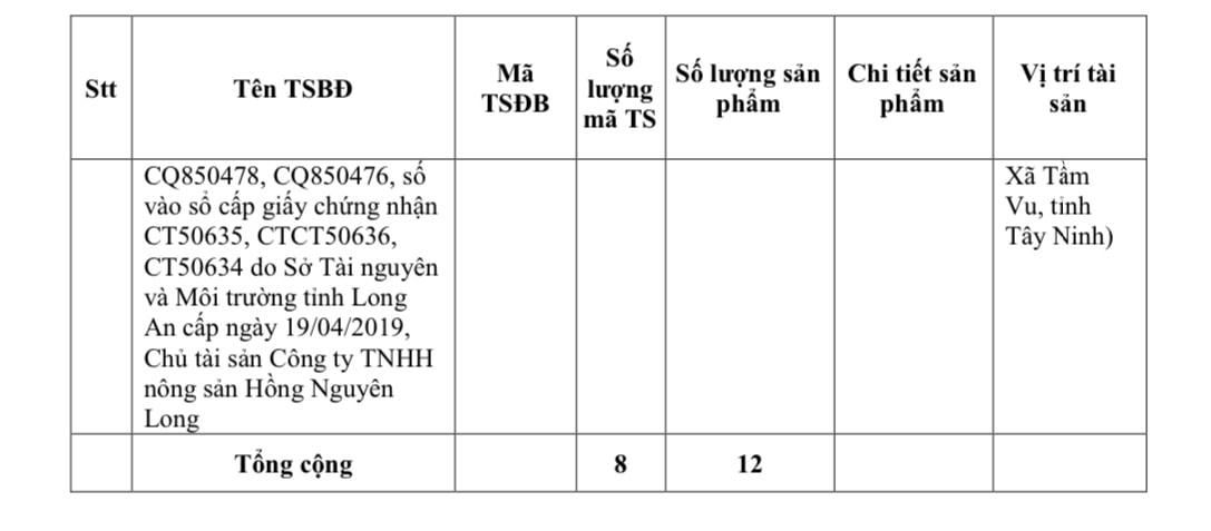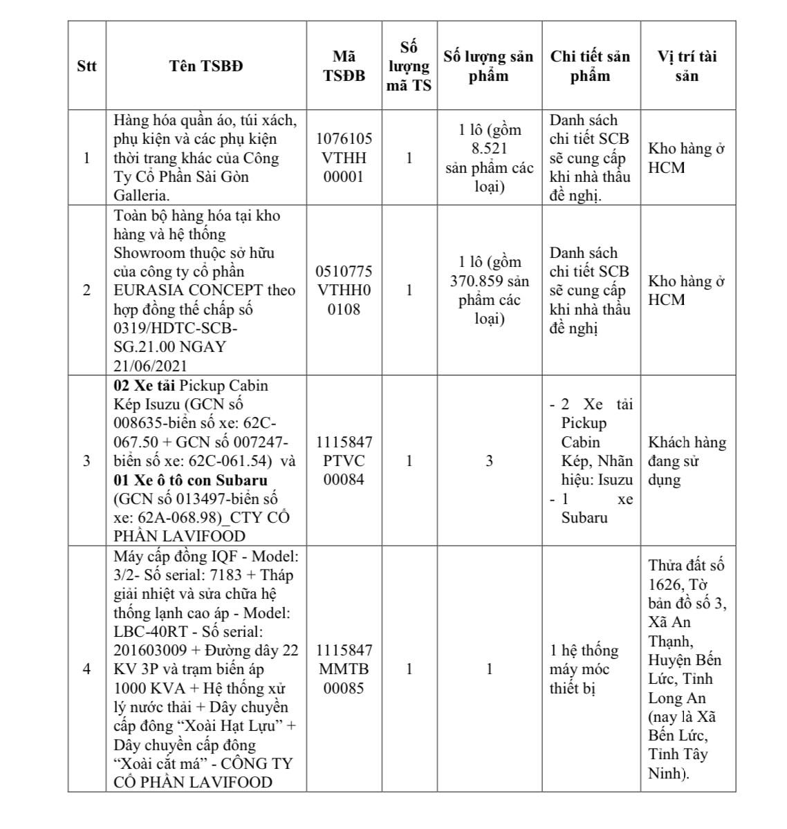 Trong đợt xử lý đầu tiên này, SCB đã hoàn thiện đầy đủ cơ sở pháp lý cho 08 mã tài sản (tương ứng 12 tài sản bảo đảm) để sẵn sàng thực hiện các thủ tục định giá, đấu giá. Danh mục bao gồm: Bất động sản giá trị cao: Quyền sử dụng đất và tài sản gắn liền với đất; Hệ thống động sản: Phương tiện vận tải, máy móc, thiết bị phục vụ sản xuất kinh doanh; Hàng hóa tiêu dùng & kho bãi: Hơn 8.500 sản phẩm thời trang (quần áo, túi xách, phụ kiện...) và hơn 370.859 chi tiết hàng tồn kho khác.