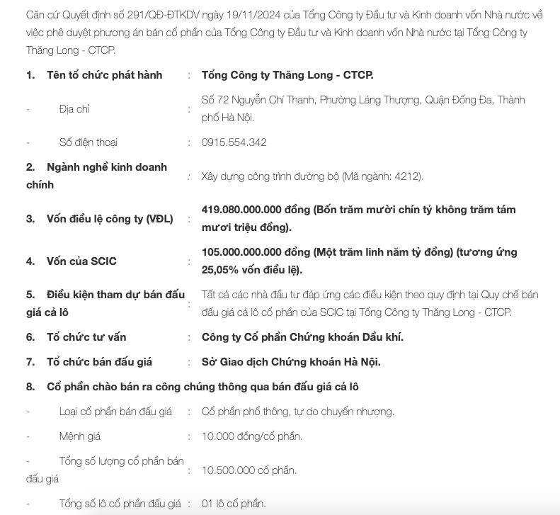 Tổng Công ty Đầu tư và Kinh doanh vốn Nhà nước (SCIC) vừa thông báo, ngày 26/12/2024 tới, SCIC sẽ tổ chức phiên đấu giá bán cổ phần Tổng công ty Thăng Long - Công ty cổ phần (mã ck: TTL).
