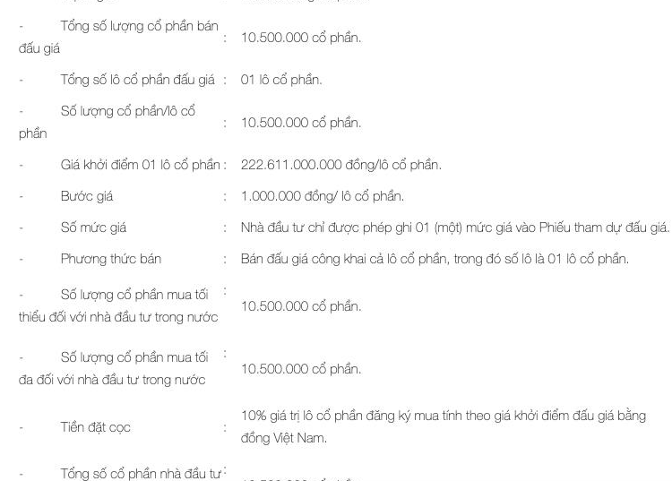 Theo quy định đấu giá được công bố, phương thức bán đấu giá công khai cả lô cổ phần. Bước giá là 1 triệu đồng/lô cổ phần. Tỷ lệ đặt cọc của nhà đầu tư tham gia dự đấu giá công khai cả lô là 10% giá trị lô cổ phần theo giá khởi điểm, tức hơn 22,2 tỷ đồng.