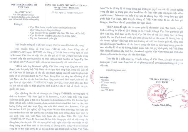 Về vấn đề này, Hội Truyền thông số Việt Nam (VDCA) ngày 02/8/2023 đã có văn bản trả lời kiến nghị của Sconnect về việc tranh chấp bản quyền giữa hai bộ nhân vật hoạt hình Wolfoo và Peppa Pig.