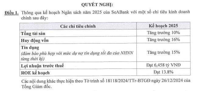 Với kế hoạch tăng trưởng tín dụng và huy động tăng trưởng 2 con số, SeABank kỳ vọng lợi nhuận trước thuế đạt 6.458 tỷ đồng, tăng 10% so với con số kế hoạch 2024. ROE kế hoạch đạt 13,8%; tổng tài sản của SeABank đặt mục tiêu tăng trưởng 10%.