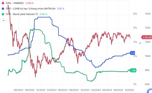 Khác với bối cảnh đầu 2024, TTCK Việt Nam bước vào 2025 kém thuận lợi hơn khi hai lực đẩy quan trọng là dòng tiền và tăng trưởng nội tại doanh nghiệp đều có biểu hiện suy yếu đáng kể. Trong bối cảnh chính sách tiền tệ nới lỏng đã hết dư địa, kế hoạch tăng trưởng tín dụng 16% năm 2025 của SBV đòi hỏi hệ thống NH sẽ phải huy động một lượng vốn rất lớn tương ứng. Điều này có thể khiến mặt bằng lãi suất tăng mạnh hơn kỳ vọng và ảnh hưởng tiêu cực tới dòng tiền nội trên TTCK vốn đã cạn kiệt sau những đợt bán ròng của khối ngoại và phát hành từ các doanh nghiệp niêm yết (chủ yếu là CK và BĐS).