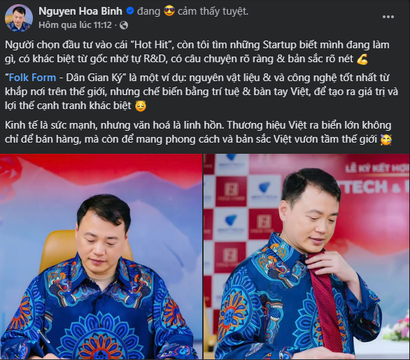Ông Nguyễn Hòa Bình, Chủ tịch Tập đoàn Nexttech, vừa công bố khoản đầu tư mới vào lĩnh vực thời trang thông qua việc hợp tác với thương hiệu Folk Form (tên tiếng Việt: Dân Gian Ký). Chi tiết về giá trị và tỷ lệ của khoản đầu tư này hiện chưa được các bên tiết lộ.