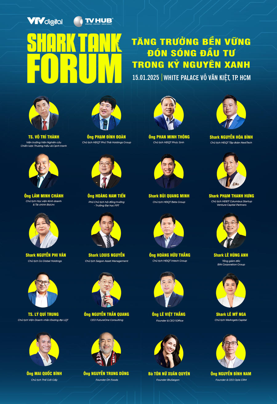 Diễn đàn Shark Tank Forum 2025 với chủ đề “Tăng trưởng bền vững - đón sóng đầu tư trong kỷ nguyên xanh” sẽ diễn ra vào ngày 15/01/2025 tại White Palace Võ Văn Kiệt, quận Bình Tân, TP HCM. Diễn đàn do TVHub, Nhà sản xuất chương trình Shark Tank Việt Nam và VTV Digital phối hợp thực hiện với Đối tác đồng hành chiến lược là VinFast - Thương hiệu ô tô Việt Nam hướng tầm nhìn trở thành hãng xe điện thông minh toàn cầu và FGF (For Green Future - Vì Tương lai Xanh) - Dịch vụ cho thuê xe linh hoạt & cao cấp.