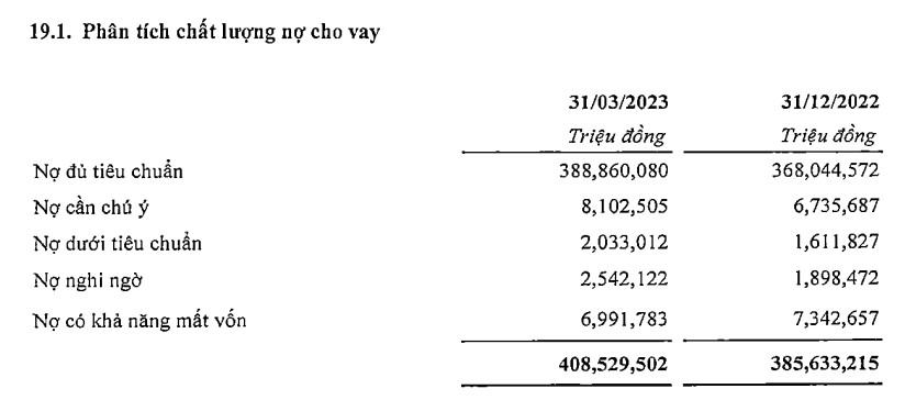 Số dư nợ xấu của ngân hàng tăng 6,6% với 11.567 tỷ đồng. Trong đó, nợ dưới tiêu chuẩn (nợ nhóm 3) tăng từ 1.611 tỷ lên 2.033 tỷ; nợ nghi ngờ (nợ nhóm 4) tăng từ 1.898 tỷ lên 2.542 tỷ và nợ có khả năng mất vốn (nợ nhóm 5) giảm từ 7.342 tỷ xuống 6.991 tỷ đồng. Kéo theo ỷ lệ nợ xấu nhích từ mức 2,81% lên 2,83%.