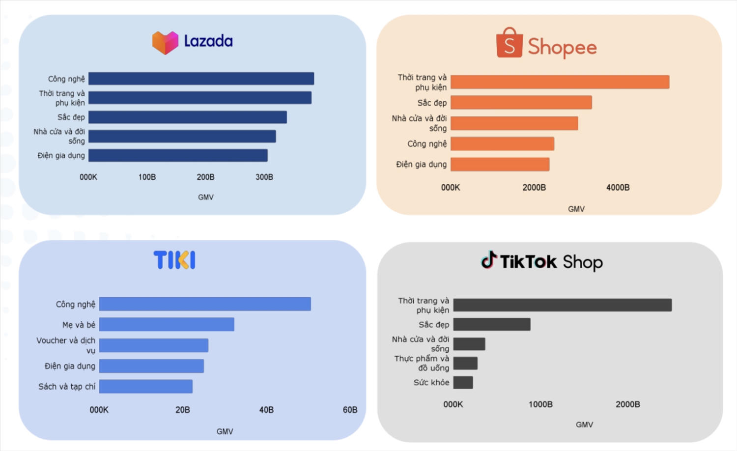 Báo cáo của YouNet ECI chỉ ra rằng, nhìn vào cụ thể từng nhóm ngành hàng, Lazada và TikTok Shop đang đi theo hai hướng riêng và mỗi sàn chiếm thị phần cao hơn trong các nhóm ngành hàng khác nhau.