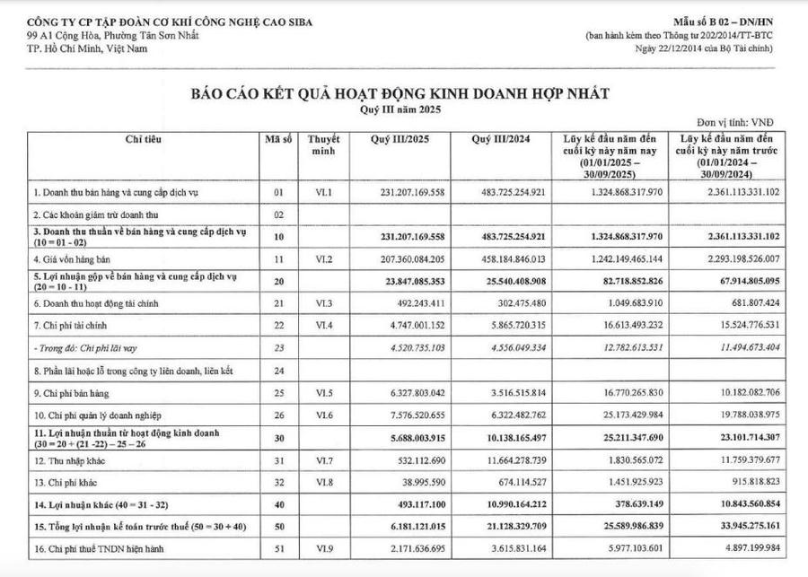 CTCP Tập đoàn Cơ khí Công nghệ cao Siba (Siba Group, mã ck: SBG) vừa công bố kết quả kinh doanh quý III/2025 và 9 tháng đầu năm.