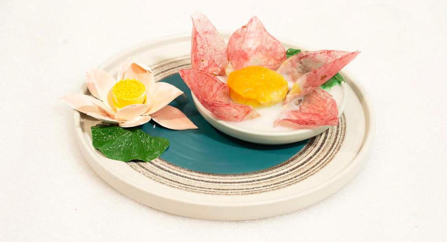 Với tập thi này, cặp pastry chef Thiện Lâm - Vi Khuyên đem đến set bánh gồm 2 chiếc: Bánh thứ nhất, bông hoa sen còn úp, Vi Khuyên cho biết lấy cảm hứng từ bánh trôi, làm từ bột nếp; phía bên trong sử dụng mứt vỏ chanh vàng. Cánh hoa sen bên ngoài là bánh tráng gạo kết hợp với ANDROS Pro Phúc Bồn Tử xay nhuyễn đông lạnh để tạo màu, sau đó sấy khô tạo thành cánh hoa.