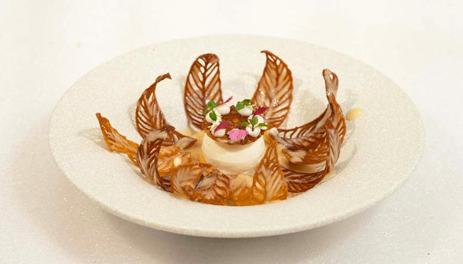 Chia sẻ về cấu tạo chiếc bánh, cặp pastry chef cho biết lớp đế sử dụng bánh cán lớp puff pastry (dòng bánh ngàn lớp). Bên trên là brandy snaps tuile (bánh quy gừng nướng giòn mỏng) dùng cà phê, mật ong, glucose và bột. Phần kem dùng nước cốt dừa kết hợp với bột ổn định stability cùng với đường glucose và đường cát.