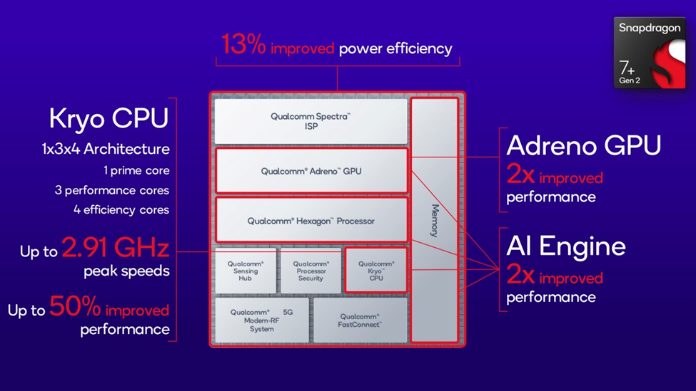 Theo Qualcomm, một con chip có dấu + trong tên không thể hiện sự cải thiện về hiệu suất so với phiên bản trước. Thay vào đó, dấu + để thể hiện con chip này nằm ở vị trí cao cấp, tốt nhất trong dòng chip đó. Snapdragon 7+ Gen 2 là một bước tiến lớn so với Snapdragon 7 Gen 1 trước đó với kiến trúc 1x3x4 trong đó có 1 lõi chính Cortex X2 có tốc độ 2.91GHz, 3 lõi Cortex A710 hiệu năng cao chạy ở xung nhip 2.49GHz và 4 lõi Cortex A510 tiết kiệm năng lượng có xung nhịp 1.8GHz. Con chip này được sản xuất trên tiến trình 4nm. Kiến trúc 1x3x4 của Snapdragon 7+ Gen 2 khá giống với Snapdragon 8+ Gen 1 đem tới sức mạnh vẫn rất tốt ở thời điểm hiện tại.