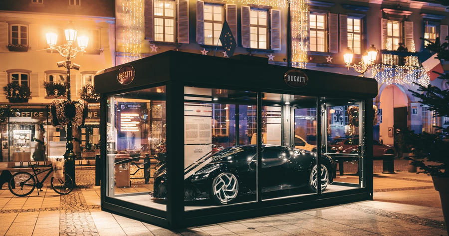 Được đặt trong một chiếc hộp kính, chiếc siêu xe có giá 11 triệu euro (13,4 triệu USD) chưa bao gồm thuế này được trưng bày bên cạnh một cây thông Noel tại trung tâm thành phố Molsheim của Pháp.