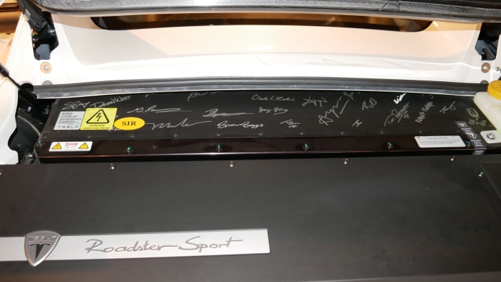 Ngoại thất của xe được sơn phủ trắng với vài chi tiết bọc carbon fiber đen. Là xe cuối cùng nên chiếc Tesla Roadster này dày đặc chữ ký của đội ngũ nhân sự Tesla kèm theo huy hiệu chứng nhận Vin 2500.