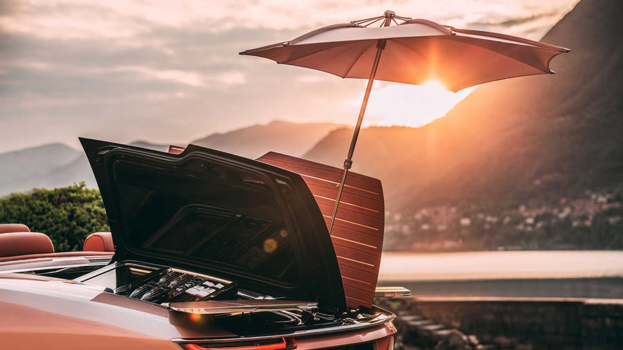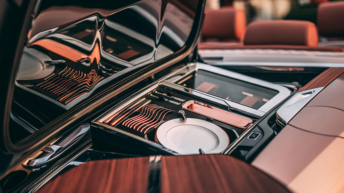 Một trong những điều làm nên đẳng cấp của Rolls-Royce Boat Tail là khu vực chứa đồ picnic nằm phía sau khoang hành khách. Hai cánh cửa ngăn chứa đồ được làm từ gỗ và mở lên theo hình dạng cánh bướm rất độc đáo.