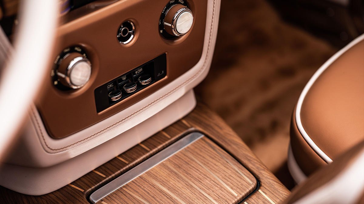 Màu của nội thất cũng được lấy cảm hứng từ vỏ ngọc trai và rượu cognac. Những chi tiết trong xe cũng được ốp bằng gỗ veneer óc chó hoàng gia với điểm nhấn màu vàng hồng và xà cừ tương đồng với phần cốp phía sau.