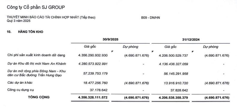 Trong đó, phần lớn nằm ở hàng tồn kho với hơn 4.351 tỷ đồng, tăng 4% so với đầu năm. Theo SJS nguyên nhân chủ yếu là chi phí sản xuất kinh doanh dở dang tại dự án khu đô thị mới Nam An Khánh hơn 4.280 tỷ đồng, dự án mở rộng phía Đông Nam - khu dân cư Bắc đường Trần Hưng Đạo hơn 57,2 tỷ đồng.