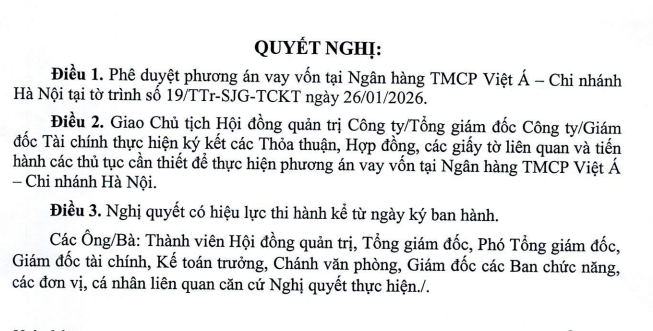 Cụ thể, HĐQT SJ Group đã phê duyệt phương án vay vốn tại Ngân hàng TMCP Việt Á, chi nhánh Hà Nội tại tờ trình số 19/TTr-SJG-TCKT ngày 26/1/2026 để thực hiện đầu tư dự án Khu nhà ở Văn La.