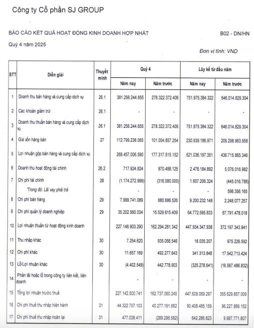 Theo giải trình của phía SJ Group, lợi nhuận sau thuế quý IV/2025 trên báo cáo tài chính hợp nhất cao hơn so với cùng kỳ năm 2024 do trong quý cuối năm 2025, công ty tiếp tục kinh doanh dự án Nam An Khánh.