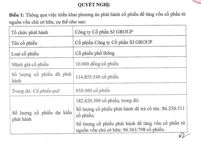 Theo kế hoạch, SJ Group dự kiến phát hành hơn 182,6 triệu cổ phiếu cho cổ đông hiện hữu. Trong đó gồm hơn 85,2 triệu cổ phiếu dùng để chi trả cổ tức các năm 2018, 2019, 2020, 2021, 2024 và gần 96,4 triệu cổ phiếu được phát hành nhằm tăng vốn từ nguồn vốn chủ sở hữu.