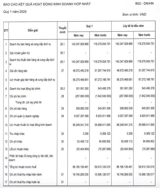 Bước sang quý I/2025, Công ty đạt doanh thu thuần 143,3 tỷ đồng, tăng 21% và lãi ròng 67,2 tỷ đồng, tăng gần 53% so với cùng kỳ. Kết quả kinh doanh tích cực trong quý I được giải trình do Công ty tiếp tục kinh doanh dự án Nam An Khánh.