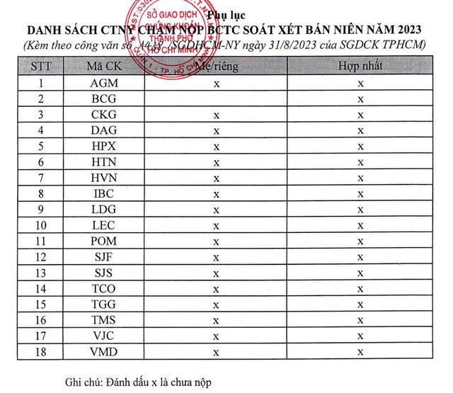 Sở Giao dịch Chứng khoán TP HCM (HOSE) nêu tên 18 công ty chậm nộp Báo cáo tài chính bán niên năm 2023