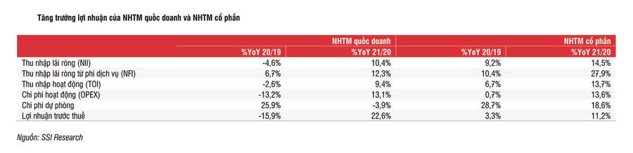 Trung tâm Phân tích Chứng khoán SSI - SSI Reserch cho rằng các ngân hàng quốc doanh chịu nhiều áp lực hơn từ NHNN trong việc hỗ trợ khách hàng trong thời kỳ đại dịch, trong khi các ngân hàng tư nhân vẫn có dư địa nhất định để cân đối giữa hỗ trợ khách hàng và đảm bảo mức lợi nhuận hợp lý.