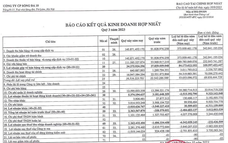 Theo báo cáo tài chính hợp nhất quý III/2023, SDT ghi nhận doanh thu thuần đạt 145,8 tỷ đồng, tăng 57% so với cùng kỳ.