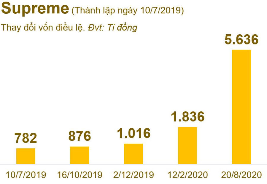 Dù chỉ mới thành lập hồi giữa năm 2019, cặp đôi này đã liên tục tăng vốn điều lệ lên trên chục nghìn tỉ đồng. Mới nhất vào hai ngày 20 và 21/8, cặp đôi Supreme và Elegance đã cùng lúc tăng vốn điều lệ. Trong đó, Supreme tăng vốn từ 1.836 tỉ đồng lên hơn 5.636 tỉ đồng, còn Elegance tăng vốn từ 1.635 tỉ đồng lên 4.935 tỉ đồng.