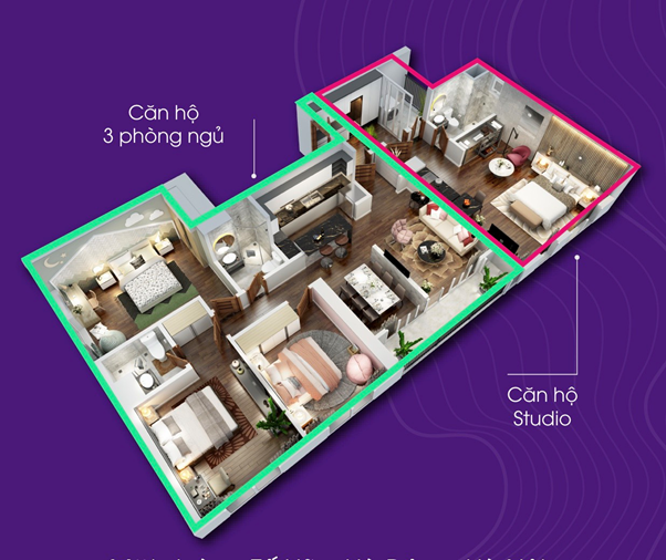 Đặc biệt, căn hộ Dual Key với thiết kế kết hợp một căn Studio 1 ngủ và một căn hộ 3 phòng ngủ là lựa chọn lý tưởng cho các gia đình muốn tìm kiếm một không gian sống thoải mái và có khả năng đầu tư, cho thuê.