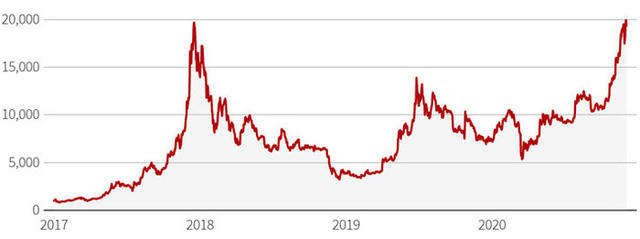 Hôm 1/12, giá Bitcoin đạt đỉnh ở 19.918 USD nhờ nhu cầu đa dạng của các nhà đầu tư - có người coi đồng tiền kỹ thuật số lớn nhất thế giới là một tài sản có độ rủi ro cao và khả năng sinh lời lớn, có người xem đây là một kênh đầu tư chống lạm phát hiệu quả, và có người xem Bitcoin là một phương pháp thanh toán đang ngày càng được chấp nhận rộng rãi.