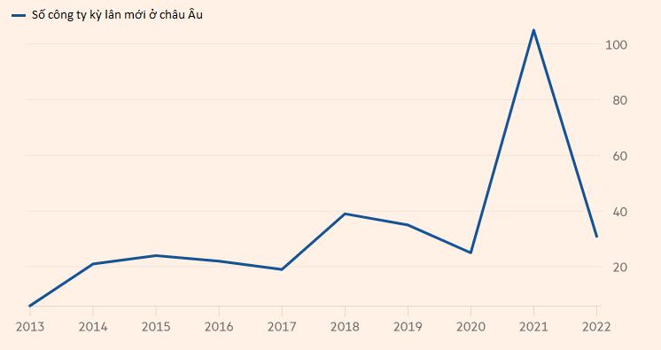 Start-up ở "lục địa già" được hưởng lợi từ đợt huy động vốn rầm rộ vào năm ngoái, dẫn đến việc hơn 100 "kỳ lân" ra đời.Con số đó giảm xuống chỉ còn 31 trong năm nay, theo báo cáo của công ty đầu tư mạo hiểm Atomico, mức thấp nhất kể từ năm 2017 (không tính năm Đại dịch 2020).