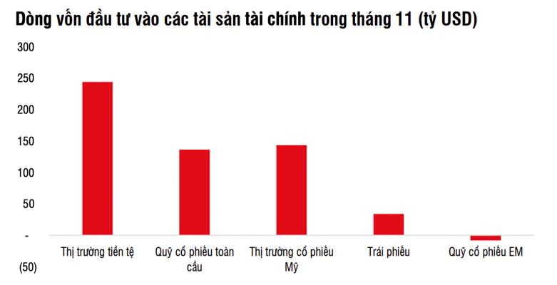 Hầu hết các thị trường đều ghi nhận kém tích cực như Trung Quốc (-4 tỷ USD), Ấn Độ (659 triệu USD). Sức hấp dẫn đối với thị trường Mỹ được kỳ vọng ít nhất sẽ duy trì trong tháng 12, khi biến động trên thị trường cổ phiếu thường thấp hơn trong tháng 12 và các công ty cũng đang thực hiện chương trình mua lại cổ phiếu quỹ như cam kết và dòng tiền chuyển dịch từ quỹ tiền tệ sang quỹ cổ phiếu khi Fed tiếp tục lộ trình cắt giảm lãi suất.